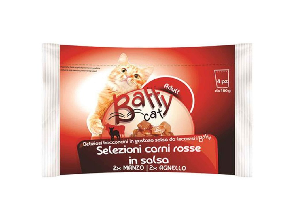 Baffy Cat šťavnaté kúsky mäsa v omáčke s hovädzím a jahňacím 100g-4ks