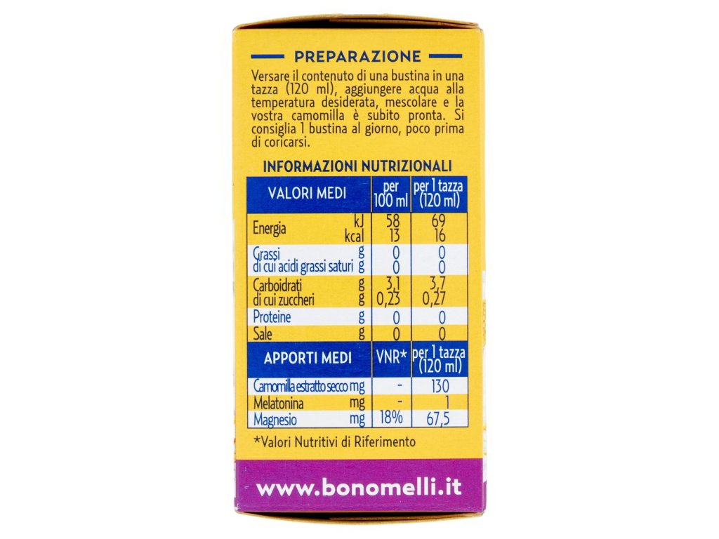Tento produkt je vyrobený z kvalitného extraktu harmančeka, pestovaného a starostlivo vyberaného po celom svete. Okrem všetkých prirodzených vlastností harmančeka obsahuje aj melatonín, ktorý prispieva k skráteniu času potrebného na zaspatie, a horčík, ktorý pomáha znižovať únavu a vyčerpanie. Pre dosiahnutie priaznivého účinku sa odporúča konzumácia 1 mg melatonínu tesne pred spaním.