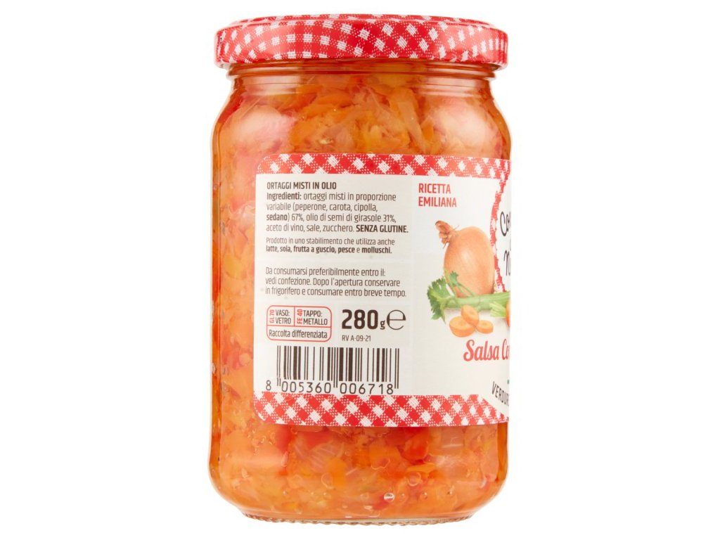 Zloženie: miešaná zelenina (67 % – paprika, mrkva, cibula, zeler), slnecnicový olej (31 %), vínny ocot, sol, cukor. Bez lepku. Vyrobené v zariadení, ktoré spracúva mlieko, sóju, orechy, ryby a mäkkýše.