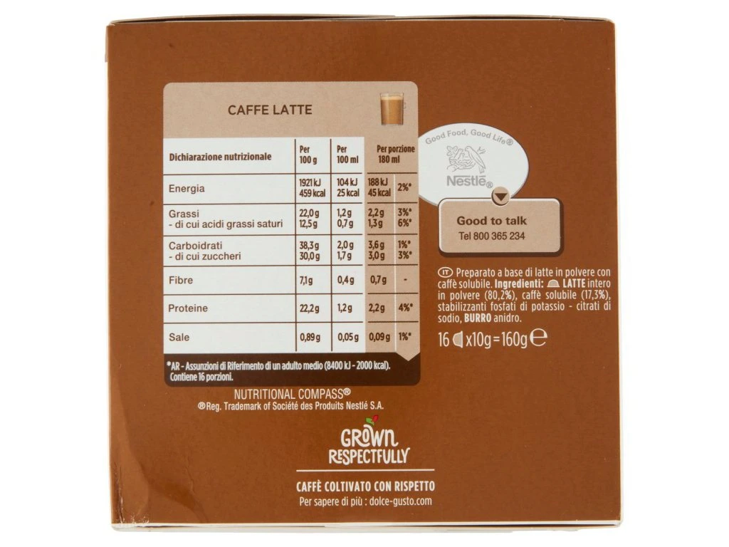 Mliečne kapsuly: Plnotučné mlieko v prášku, Emulgátory (E471, E472e), Stabilizátory (E339, E340). Kávové kapsuly: Pražená mletá káva