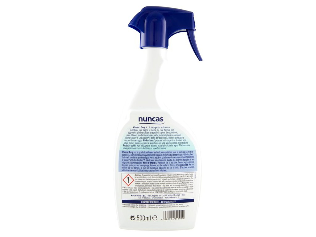 Nuncas Wannet Easy je každodenný čistič proti vodnému kameňu, vhodný do kúpeľne aj kuchyne. Jeho jemná, no účinná formula odstraňuje vápenaté usadeniny a zvyšky mydla z batérií, keramických a sklenených povrchov, plastových materiálov a kompozitov ako Corian® a Cristalplant®.