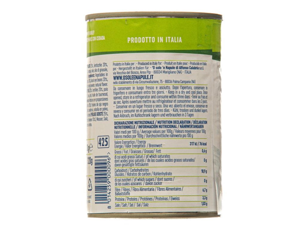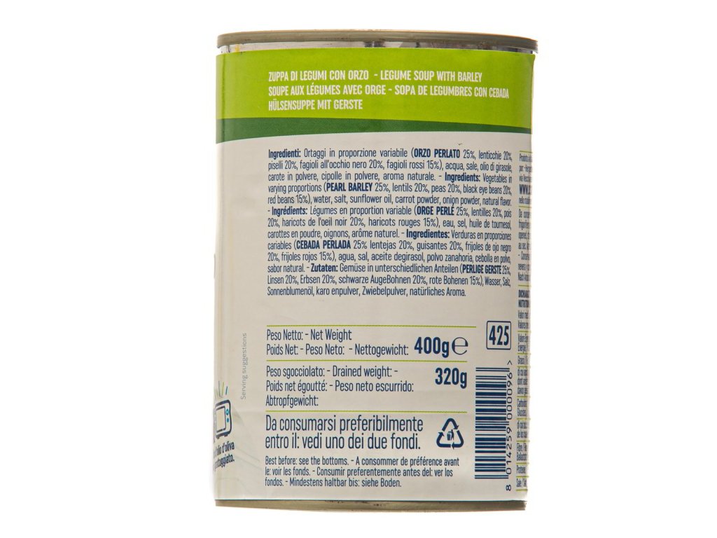 Ingrediencie: Zelenina v rôznom pomere (perličkový jačmeň 25 %, šošovica 20 %, hrášok 20 %, čierne fazule 20 %, červené fazule 15 %), voda, soľ, slnečnicový olej, mrkvový prášok, cibuľový prášok, prírodná aróma.
