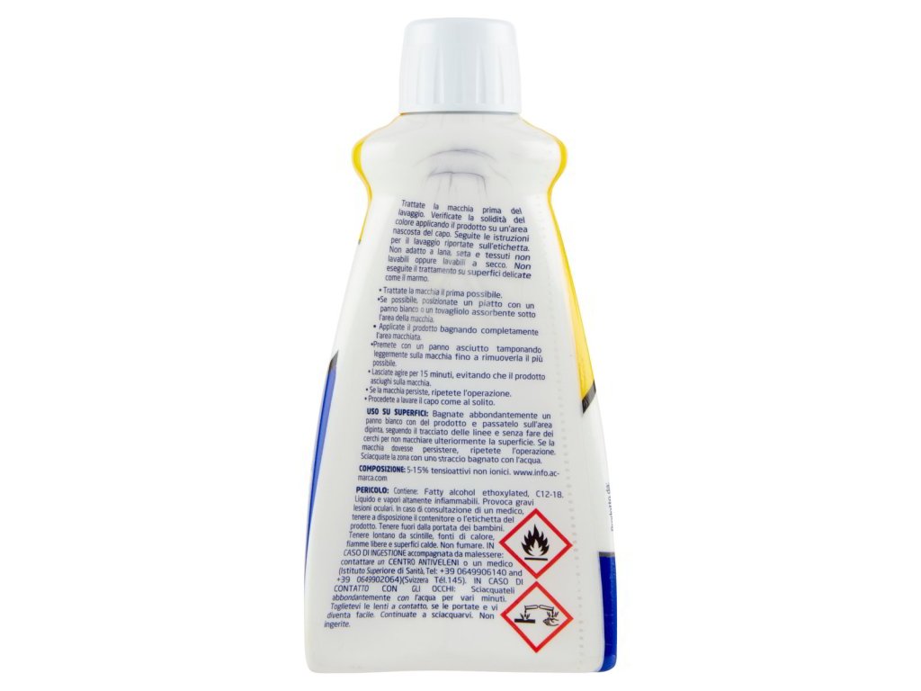 Tento odstraňovač škvŕn je určený na predbežnú úpravu znečisteného oblečenia pred praním. Obsahuje neiónové tenzidy a alkoholové zložky, ktoré účinne rozpúšťajú nečistoty. Nesmie sa používať na vlnu, hodváb a iné citlivé materiály. Produkt je vysoko horľavý a je nutné ho skladovať mimo dosahu detí a zdrojov tepla. Pri kontakte s očami môže spôsobiť vážne podráždenie, preto sa odporúča používanie ochranných prostriedkov pri manipulácii.