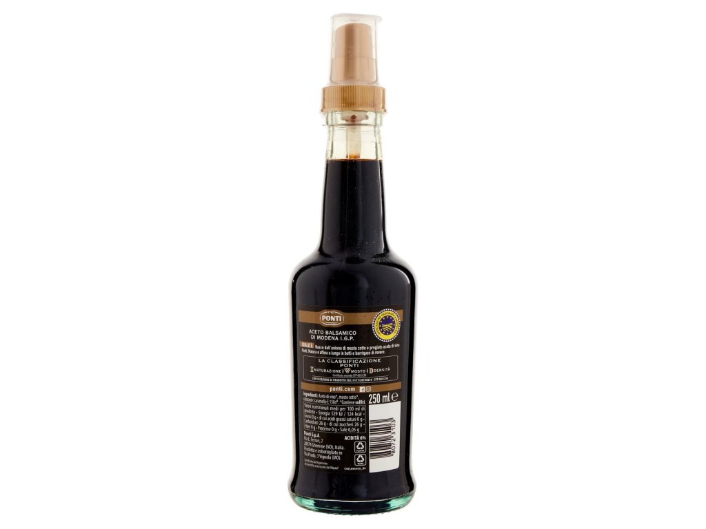 Kľúčové tagy: Ponti balzamikový ocot z Modeny I.G.P. v spreji, taliansky balzamikový ocot, kvalitný ocot, tradičný taliansky produkt, výživný ocot, gurmánske dochucovadlo, prémiové produkty, zdravé dochutenie, domáce varenie, prírodné suroviny, jemná textúra, talianska kuchyňa, talianske dochucovadlá, autentická chuť, výborné dochutenie, tradičné produkty