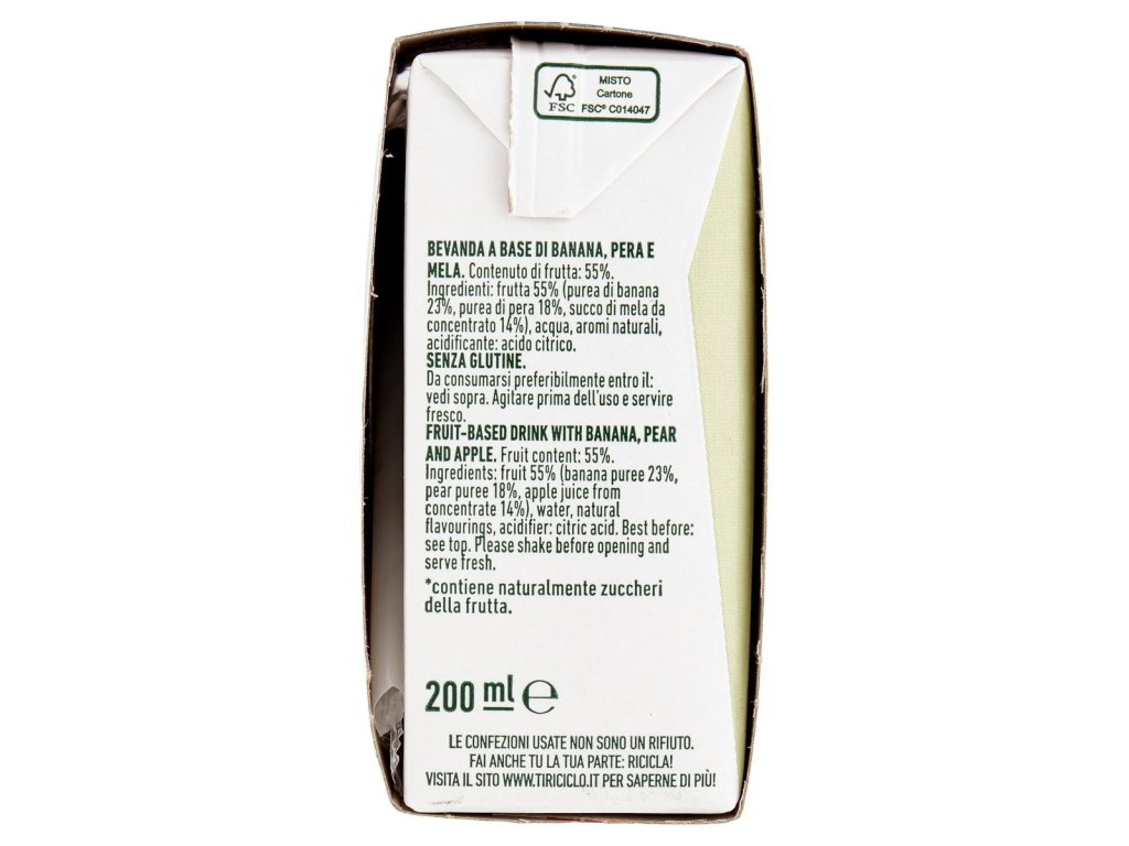 Zloženie: ovocie 55 % (banánové pyré 23 %, hruškové pyré 18 %, jablková šťava z koncentrátu 14 %), voda, prírodné arómy, regulátor kyslosti: kyselina citrónová. Bez lepku.